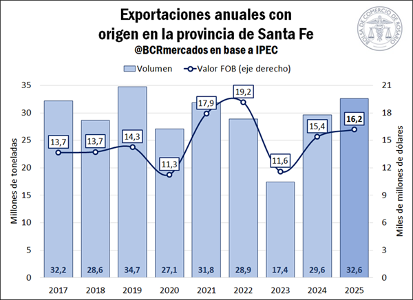 Según datos del Instituto Provincial de Estadística y Censos (IPEC), en 2025 las exportaciones con origen en la provincia de Santa Fe totalizaron 32,6 Mt, lo que representa un incremento del 10,1% en comparación al año anterior, y un sólido aumento del 20,9% respecto al promedio de los últimos cinco años. Incluso, analizando los datos en términos históricos, este volumen resulta el segundo más elevado desde el inicio de la serie en 2017, únicamente por detrás del año 2019.