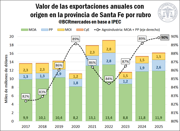 En este sentido, se advierte que los volúmenes exportados de manufacturas de origen agropecuario (MOA) crecieron un 4% interanual en 2025 y se situaron 21% por encima de la media. Al igual que en los años anteriores, este sector fue el que más contribuyó al valor total de las exportaciones, dando cuenta del 74% de las ventas externas por un monto de U$S 11.916 millones. Por su parte, las exportaciones de productos primarios (PP) crecieron un 30% frente a 2024 y un 28% en relación con el promedio. Este rubro concentró el 16% del valor de las exportaciones con origen en la provincia de Santa Fe, por un total de U$S 2.631 millones. De esta manera, la agroindustria se destacó nuevamente como el principal rubro que aporta divisas en nuestra provincia, siendo responsable del 90% del valor de las exportaciones de Santa Fe durante 2025 y marcando una participación máxima desde, al menos, 2017.
