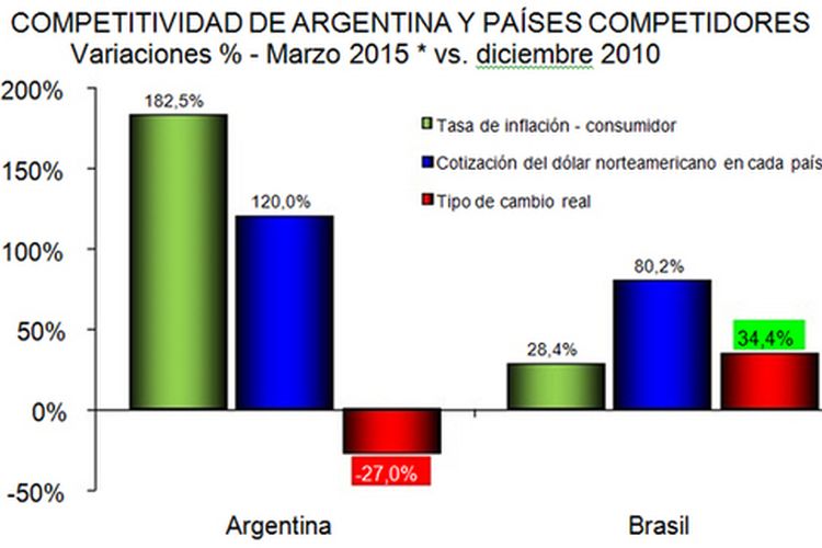 Sobre este tema se refirió nuevamente a la pérdida de competitividad que enfrenta la economía argentina en general y el sector cárnico en particular. “Con datos a marzo de 2015, el deterioro del tipo de cambio real de Argentina (contra el dólar) ascendió a 27,0% con relación al cierre de 2010, al tiempo que la mejora de la competitividad de las producciones brasileñas llegó a 34,4% en igual lapso de tiempo. En consecuencia, el deterioro de la competitividad de Argentina con relación a la de Brasil pasó de 37,1% acumulado a diciembre del año pasado, a 45,6% a la primera semana de marzo de 2015”.