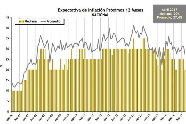 Según el promedio, las expectativas de inflación caen 3,9 puntos porcentuales respecto de la medición de marzo de 2017 y se ubican en el 27,4%.