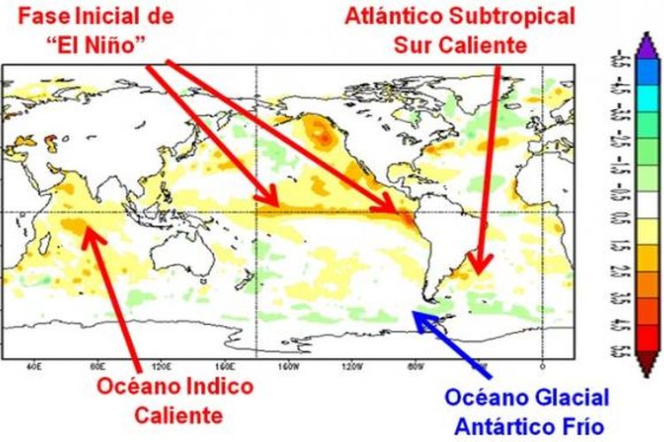 Durante las últimas semanas, el Océano Pacífico Ecuatorial continuó calentándose por encima de lo normal, dando inicio temprano en un episodio de “El Niño”. El calentamiento del Atlántico imprimirá una fuerte irregularidad a las precipitaciones.