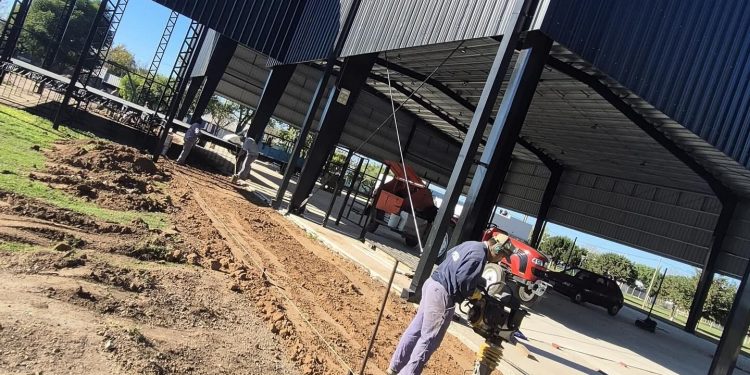 La obra inició con la construcción de las veredas perimetrales, sobre las cuales se instalarán las aberturas que conformarán el cerramiento del polideportivo.