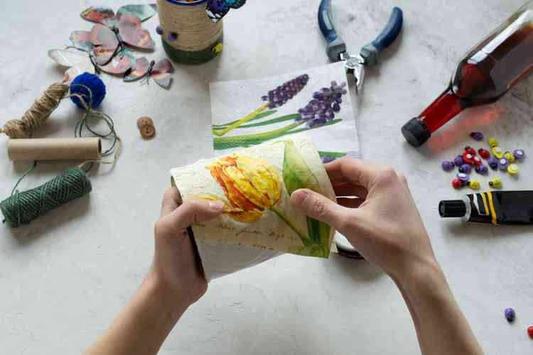 Decoupage tiene su origen en la palabra francesa “découper”, que significa recortar. Consiste en decorar superficies (de todo tipo, desde céramica, madera, cartón e incluso jabones o velas) con imágenes de papel o de tela recortadas y que son fijadas a la superficie que se quiera decorar con un barniz.