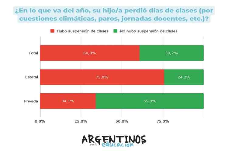 Según los resultados de la Encuesta Nacional Escolar, el 60,8% de las madres consultadas informan que sus hijos perdieron días de clase en primaria durante el primer semestre del año. La interrupción de la continuidad escolar fue mayor en las escuelas estatales (donde el 75,8% de las familias reportan interrupciones) que en las escuelas de gestión privada (donde la cifra es menos de la mitad: 34,1%).