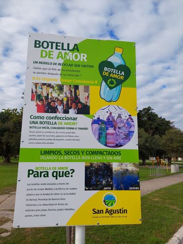 Personal de la comuna de San Agustín informa a los vecinos la colocación de la nueva cartelería informativa del proyecto educativo “Botella de amor”, cuyo objetivo se centra en la recolección de botellas y materiales de plástico vacías para su reciclaje.